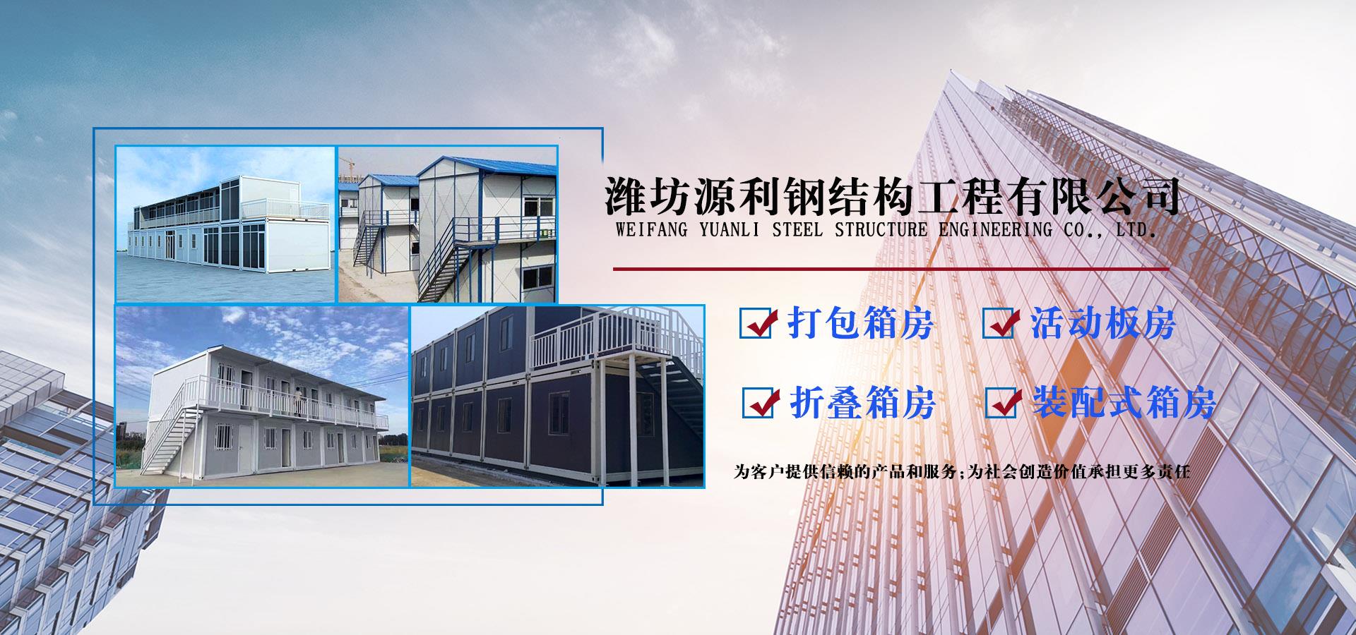 濰坊源利鋼結構工程有限公司成立于2015年,是一家從事活動房屋,鋼結構設計、制作、安裝為一體的公司。公司坐落于風景秀麗的藍寶石之鄉昌樂開發區,占地約60畝,年加工生產能力到40萬平米,現已發展成本地較大的鋼結構企業,同時也已跨入集成房屋研發、推廣企業行列。公司配備了全套的箱房流水線生產設備,包含了全自動冷彎成型設備、流水自動涂裝線、沖壓型材生產線以及全套的配套設備,標準化、模具化生產加工,年生產5000套打包箱,產品保障。 公司主要產品有:鋼結構工程加工、制作、安裝;各類活動板房、打包箱房、裝配式箱房、折疊箱房、圍擋、料棚、異型H型鋼、屋面板、墻面板、樓承板,C型鋼,Z型鋼;馬路隔離護欄等相關產品。